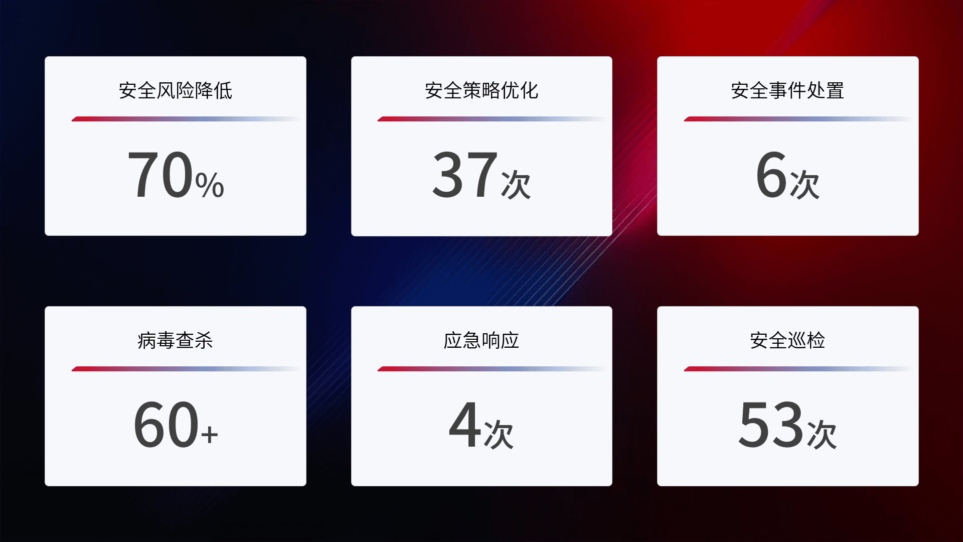 提供全面的安全事件报告体系,,,包括处置报告、、周报、、季度和年度总结,,,,结合持续监控,,,帮助客户深入了解网络安全状况。。。